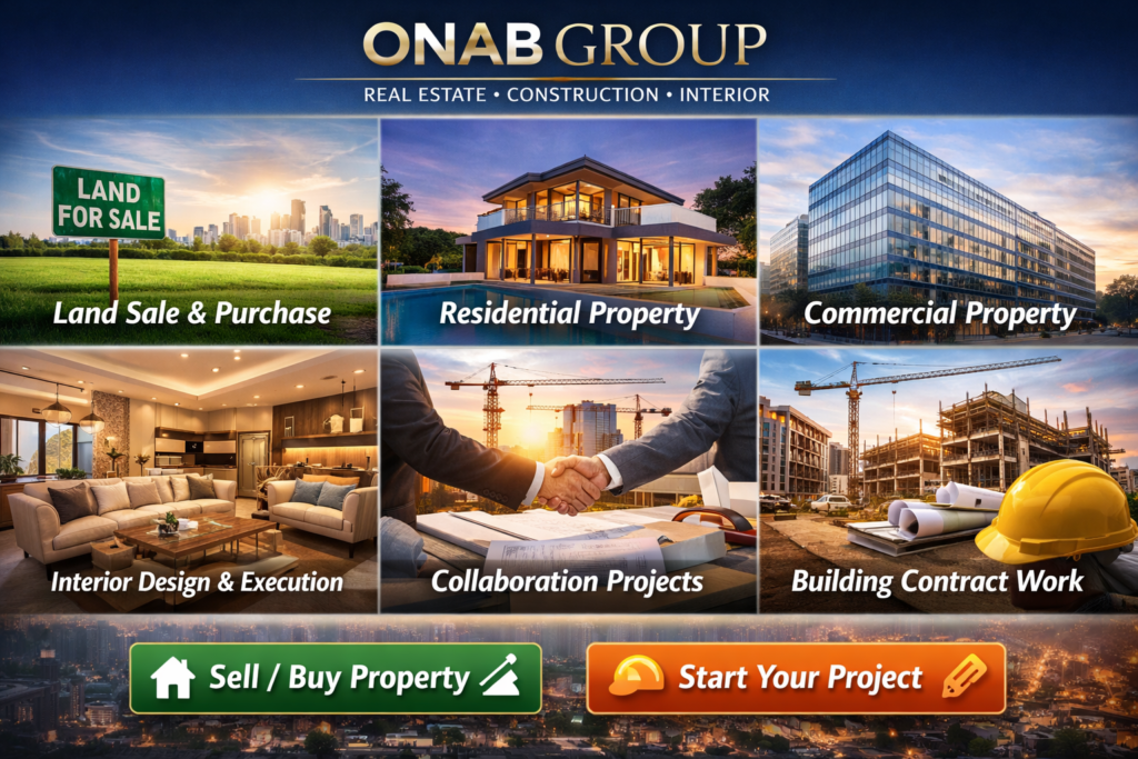 ONAB GROUP www.onab.in CALL US OUR SERVICES ONAB GROUP ek professional real estate & construction company hai jo PAN INDIA property solutions provide karti hai. Hum Residential, Commercial, Interior, Land Dealings aur Building Contracts me expert hain. Book Free Consultation Land Sale & Purchase Residential Property Commercial Property Interior Design & Execution Collaboration Projects Building Contract Work Sell / Buy Property Start Your Project